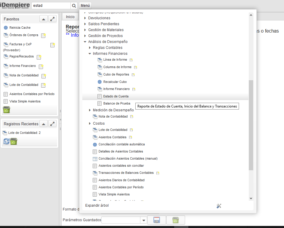 1. En el Menú seguimos la siguiente jerarquía: / Análisis de desempeño / Informes Financieros / Estado de Cuenta.