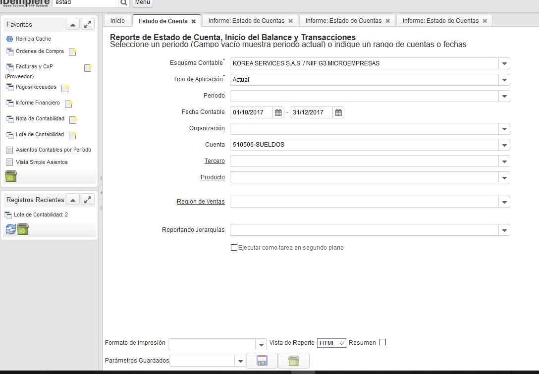 3. Escogemos las fechas contables 01/10/2017 y 31/12/2017, estas indican el periodo o rango a consultar.